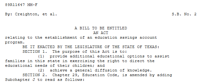 이번에 통과된 상원법안(Senate Bill 2, SB 2)은 학부모가 자녀의 사립학교 등록금, 홈스쿨링 비용, 교재·교통비·치료비 등에 사용할 수 있는 ‘교육 저축 계좌(Education Savings Account, ESA)’를 도입하는 내용을 담고 있다.